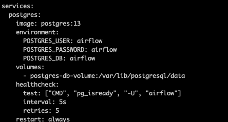 3eda287e2e66 postgres:13 "docker-entrypoint.s…" 6 minutes ago Up 6 minutes (healthy) 5432/tcp airflow_postgres_1